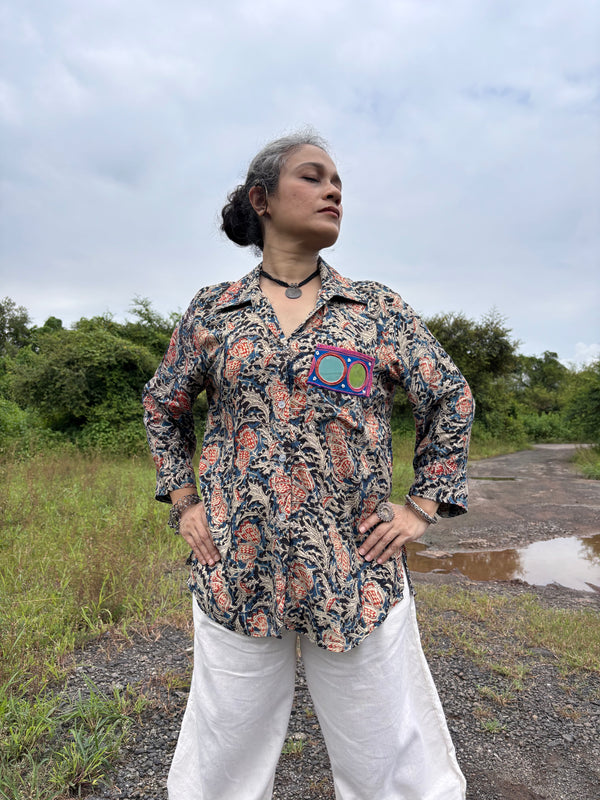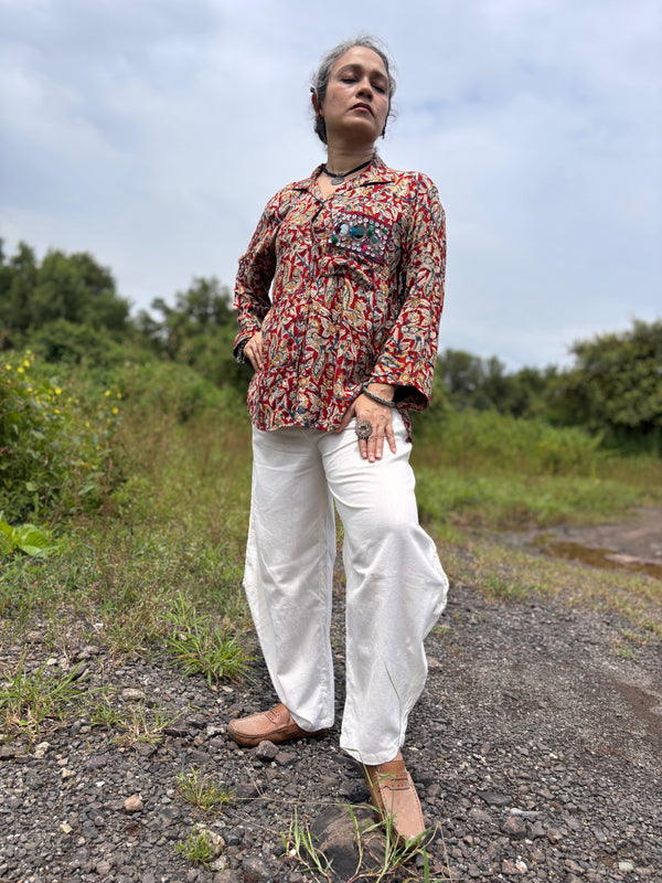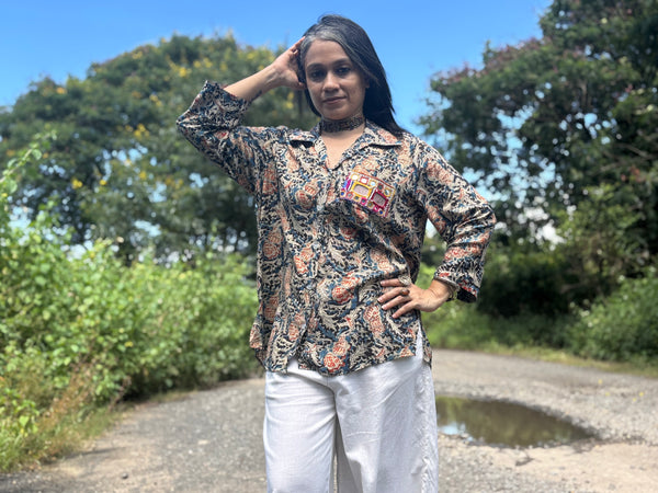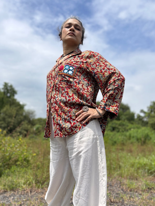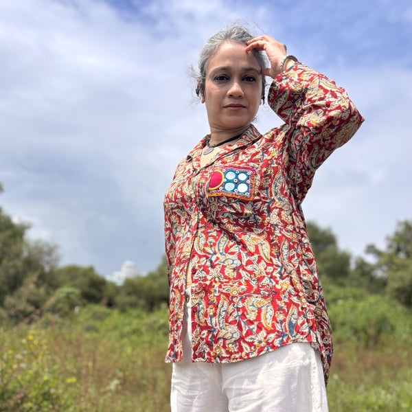 The two traditional art forms — Kalamkari from Andhra Pradesh and vibrant hand embroidery from Rajasthan — blend perfectly to create the desired look.